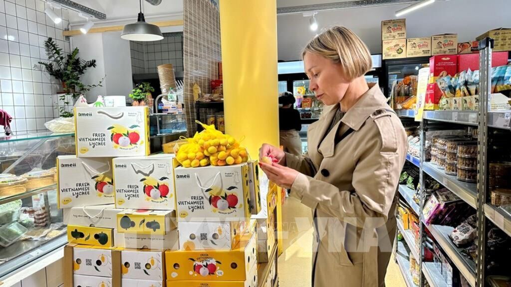 | Một khách hàng Pháp đang nếm thử trái vải thiều đầu tiên của mùa vụ 2025 của Việt Nam. Ảnh: Nguyễn Thu Hà/PV TTXVN tại Pháp |