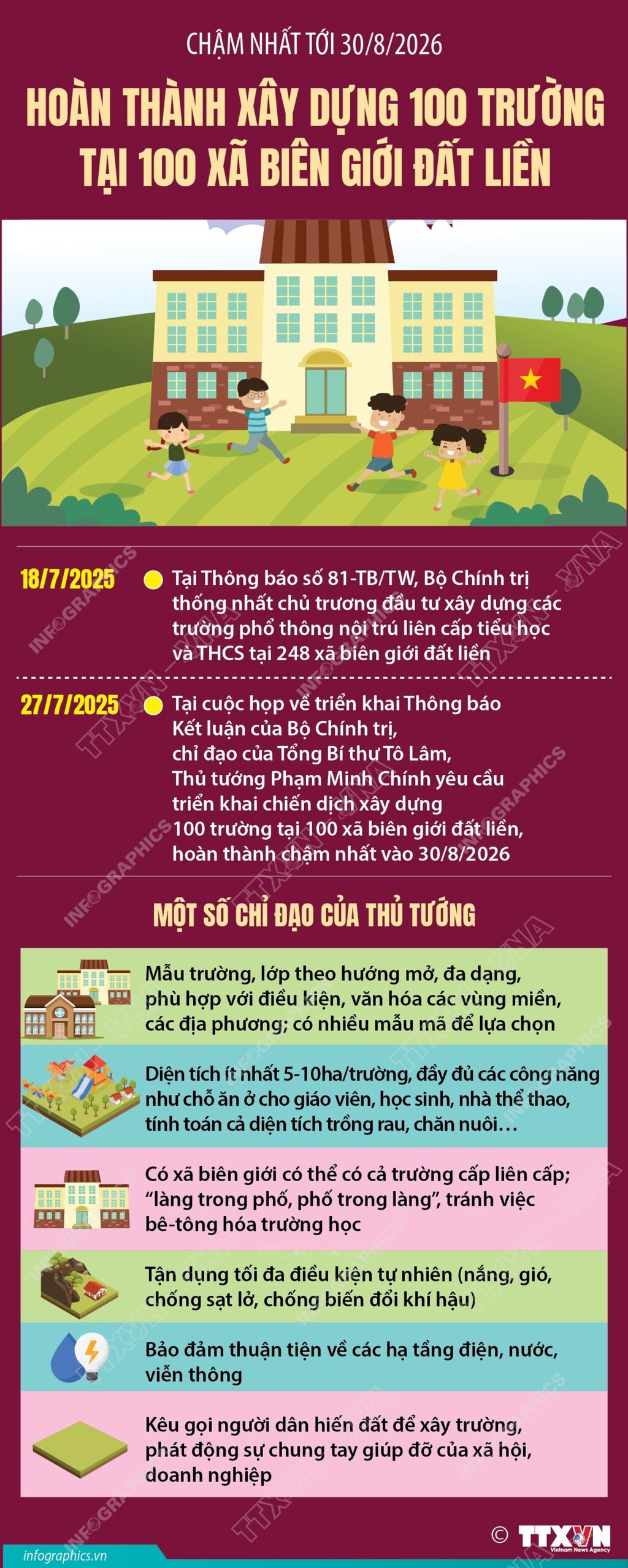 Ngày 27/7/2025, Thủ tướng Chính phủ Phạm Minh Chính chủ trì họp với các bộ, ngành triển khai chiến dịch xây dựng trường học và nhà ở nội trú cho học sinh, giáo viên xã biên giới đất liền trong cả nước. Thủ tướng Chính phủ Phạm Minh Chính chỉ rõ Thông báo số 81-TB/TW của Bộ Chính trị về chủ trương đầu tư xây dựng trường học cho các xã biên giới là quyết sách lớn, có ý nghĩa chính trị-xã hội sâu sắc; phải khẩn trương triển khai, trong đó triển khai thần tốc, táo bạo để hoàn thành xây dựng 100 trường học tại 100 xã biên giới trước ngày 30/8/2026.