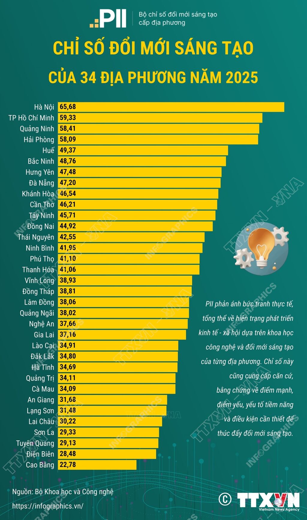 Chỉ số đổi mới sáng tạo năm 2025 của 34 địa phương