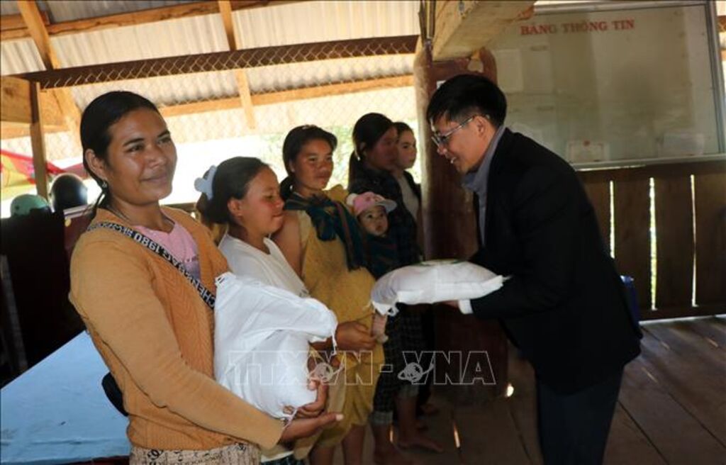 | Chính quyền xã Măng Ri hỗ trợ gạo cho người dân khi dời làng. Ảnh: Cao Nguyên-TTXVN |