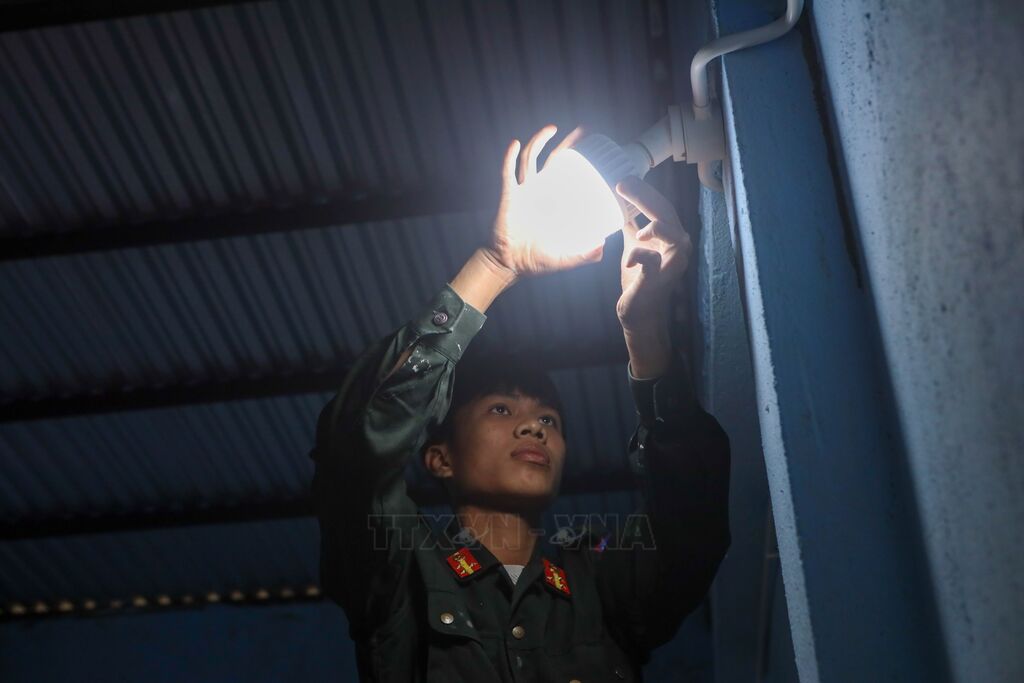 | Chiến sĩ Trung tâm Huấn luyện, bồi dưỡng nghiệp vụ và giáo dục nghề nghiệp số 3 – Bộ Tư lệnh Cảnh sát cơ động lắp hệ thống điện thắp sáng cho nhà dân tại xã Thượng Đức. |