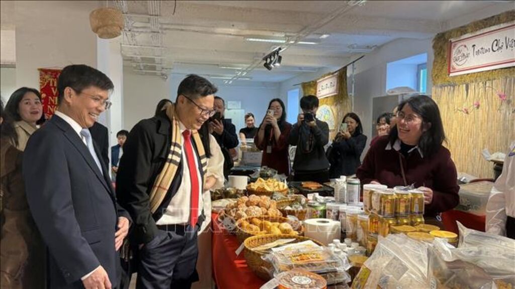 | Đại sứ Việt Nam tại Pháp tham quan một gian hàng ẩm thực truyền thống trong khuôn viên Chợ Xuân Bính Ngọ 2026. |