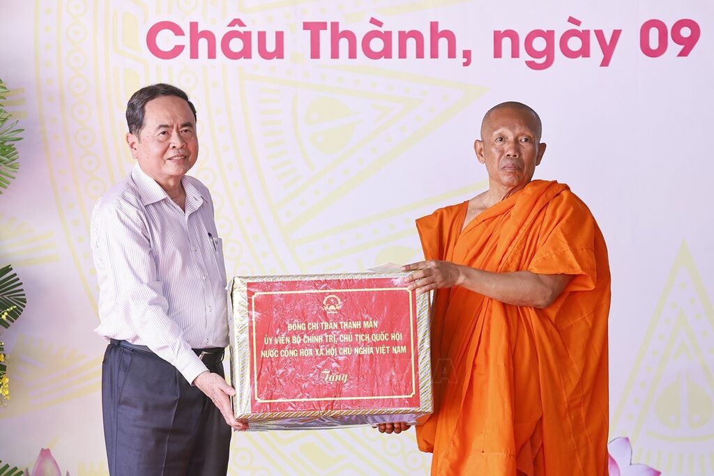 | Chủ tịch Quốc hội Trần Thanh Mẫn tặng quà đại biểu tại Chùa Tum Núp. |