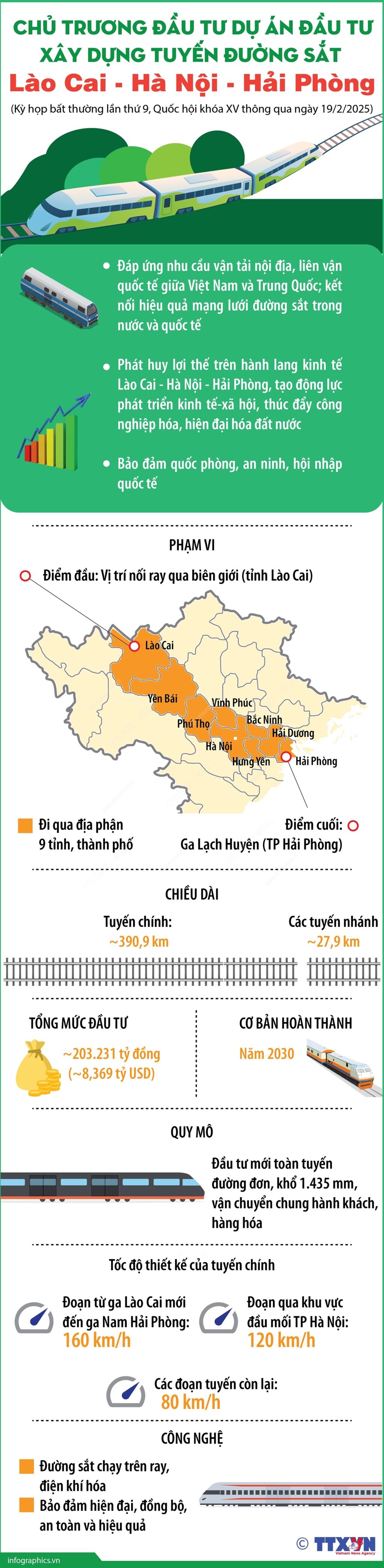 Dự án đầu tư xây dựng tuyến đường sắt Lào Cai - Hà Nội - Hải Phòng nhằm đáp ứng nhu cầu vận tải nội địa, liên vận quốc tế giữa Việt Nam và Trung Quốc; tạo động lực quan trọng cho phát triển kinh tế - xã hội nhanh và bền vững, phát huy lợi thế trên hành lang kinh tế Lào Cai - Hà Nội - Hải Phòng, bảo đảm kết nối hiệu quả các mạng lưới đường sắt trong nước và quốc tế, gắn với bảo đảm quốc phòng, an ninh và hội nhập quốc tế, bảo vệ môi trường, ứng phó với biến đổi khí hậu; thúc đẩy tiến trình công nghiệp hóa, hiện đại hóa đất nước... Sơ bộ tổng mức đầu tư của Dự án là 203.231 tỷ đồng. Nghị quyết về chủ trương đầu tư Dự án xây dựng tuyến đường sắt Lào Cai - Hà Nội - Hải Phòng đã được Kỳ họp bất thường lần thứ 9, Quốc hội khóa XV thông qua ngày 19/2/2025 với 455/459 đại biểu tham gia biểu quyết tán thành (chiếm 95,19% tổng số đại biểu).