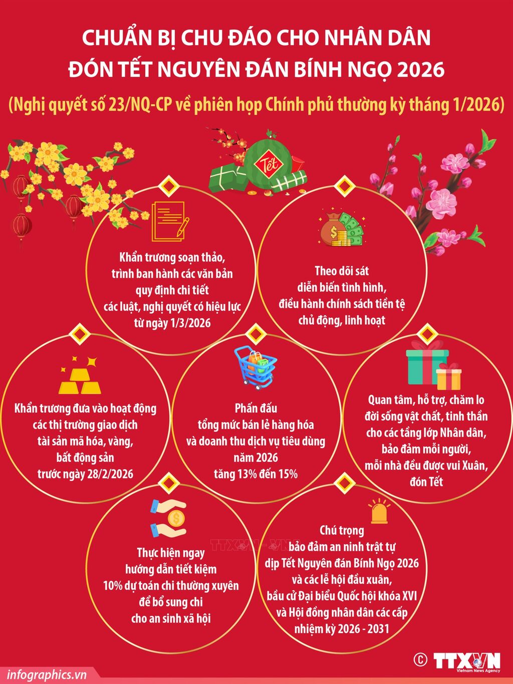 Chính phủ ban hành Nghị quyết số 23/NQ-CP về phiên họp Chính phủ thường kỳ tháng 1/2026, trong đó yêu cầu các địa phương chuẩn bị chu đáo cho nhân dân đón Tết Nguyên đán Bính Ngọ 2026; quan tâm, hỗ trợ, chăm lo đời sống vật chất, tinh thần cho các tầng lớp Nhân dân, bảo đảm mỗi người, mỗi nhà đều được vui Xuân, đón Tết.