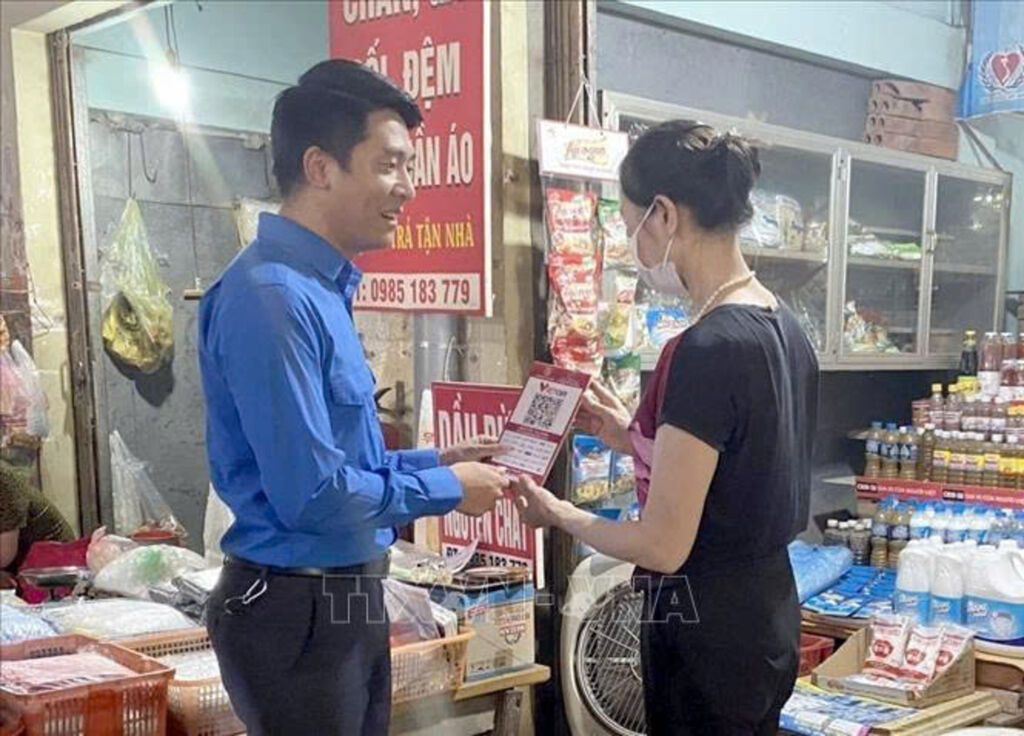 | Đoàn viên, thanh niên tổ công nghệ số cộng đồng hướng dẫn tiểu thương sử dụng mã QR code. |