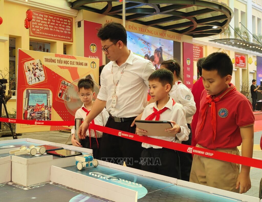 | Học sinh Trường Tiểu học Tràng An (quận Hoàn Kiếm, Hà Nội) trải nghiệm các sản phẩm chuyển đổi số. |