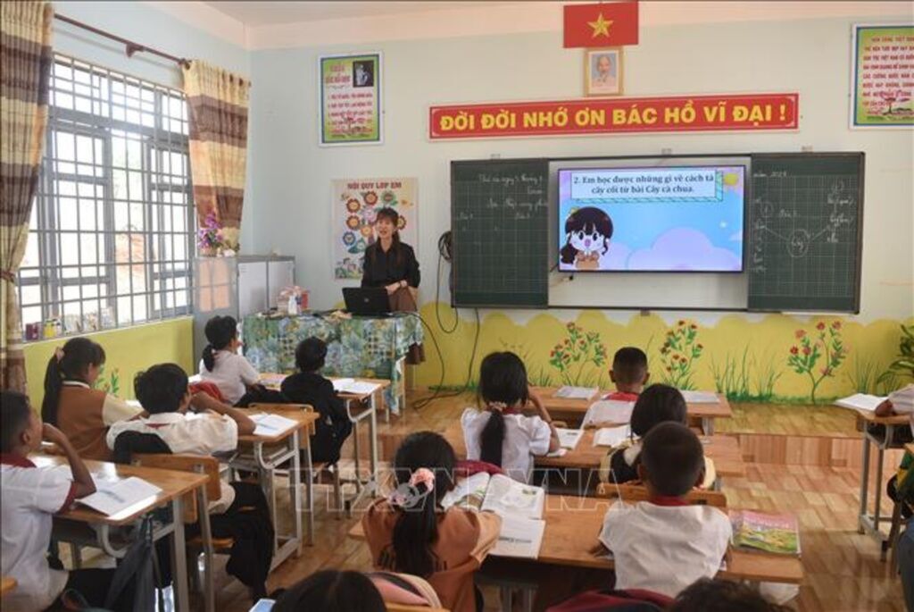 | Giáo viên trường Tiểu học Lý Tự Trọng, xã Ea Kuêh, huyện Cư M’gar, tỉnh Đắk Lắk giảng bài cho học sinh thông qua trình chiếu bài học trên màn hình. |