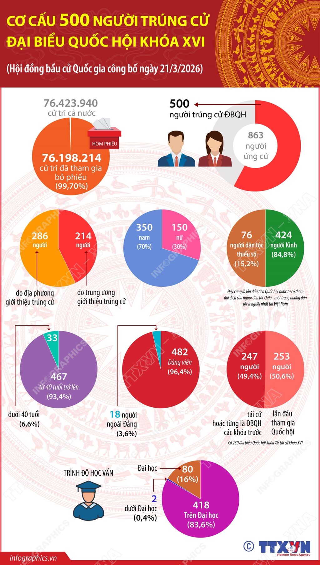 Chiều 21/3/2026, tại cuộc họp báo công bố Nghị quyết của Hội đồng Bầu cử quốc gia về kết quả bầu cử và danh sách những người trúng cử đại biểu Quốc hội khóa XVI, ông Nguyễn Hữu Đông, Chủ nhiệm Ủy ban Công tác đại biểu của Quốc hội, Phó Trưởng Ban Tổ chức Trung ương, Ủy viên Hội đồng Bầu cử quốc gia, Phó Trưởng Tiểu ban Nhân sự thông tin: Đại biểu nữ là 150 người (tỷ lệ 30%); đại biểu người dân tộc thiểu số là 76 người (tỷ lệ 15,2%); đại biểu ngoài Đảng là 18 người (tỷ lệ 3,6% - con số này có tăng hơn so với nhiệm kỳ trước); đại biểu có độ tuổi dưới 40 tuổi là 33 người (tỷ lệ 6,6%). Về trình độ học vấn, 418 đại biểu trúng cử có trình độ trên đại học (thạc sĩ, tiên sĩ), 80 người có trình độ Đại học và 2 người có trình độ dưới đại học.