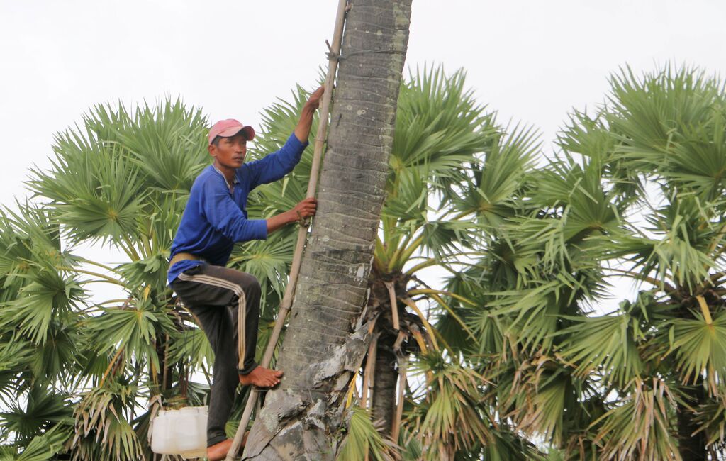 | Mỗi ngày, bà con leo lên ngọn cây để lấy nước từ hoa thốt nốt hai lần, mỗi lần cách nhau không quá 8 giờ, để về nấu thành đường thốt nốt thô. |