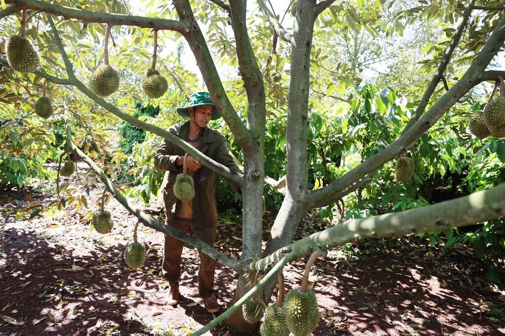 | Là người con của buôn làng Jung A, anh Y Grung Byă (xã Ea Ktur, huyện Cư Kuin) chăm sóc vườn sầu riêng xen cà phê của gia đình. |