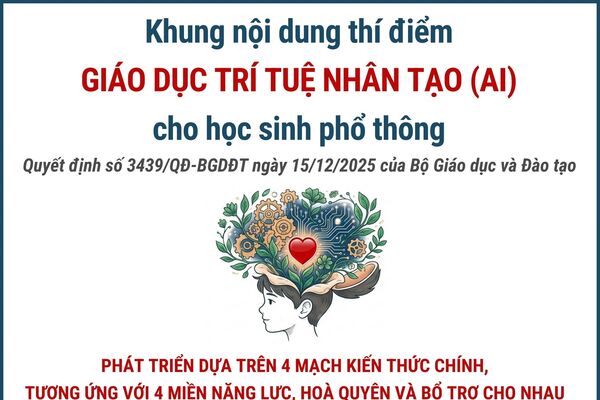 Bộ Giáo dục và Đào tạo vừa có Quyết định số 3439/QĐ-BGDĐT ban hành Khung nội dung thí điểm giáo dục trí tuệ nhân tạo (AI) cho học sinh phổ thông. Khung nội dung giáo dục AI cho học sinh được phát triển dựa trên 4 mạch kiến thức chính, tương ứng với 4 miền năng lực, hòa quyện và bổ trợ cho nhau, gồm: Tư duy lấy con người làm trung tâm, đạo đức AI, các kĩ thuật và ứng dụng AI, thiết kế hệ thống AI. Khung nội dung được thiết kế tương ứng với 2 giai đoạn giáo dục: Giai đoạn giáo dục cơ bản (gồm cấp tiểu học và cấp Trung học cơ sở) và giai đoạn giáo dục định hướng nghề nghiệp (cấp Trung học phổ thông).