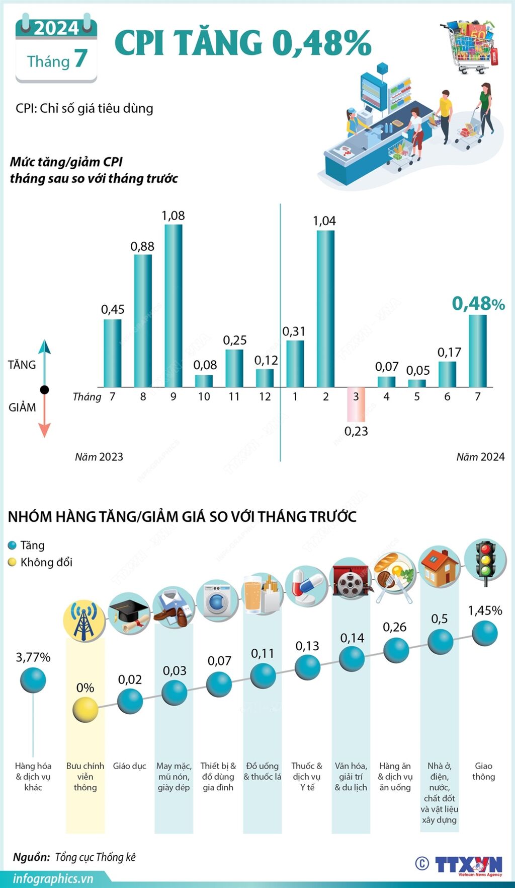 Chỉ số giá tiêu dùng (CPI) tháng 7/2024 tăng 0,48% so với tháng trước. Trong đó, có 10 nhóm hàng hóa và dịch vụ có chỉ số giá tăng; riêng nhóm bưu chính, viễn thông ổn định giá.