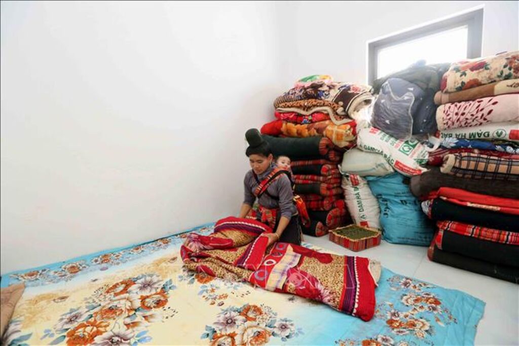 | Chị Lò Thị Thơi, bản Nậm Pù, xã Huổi Một, tỉnh Sơn La sắp xếp vật dụng gia đình để về ở trong căn nhà mới. |