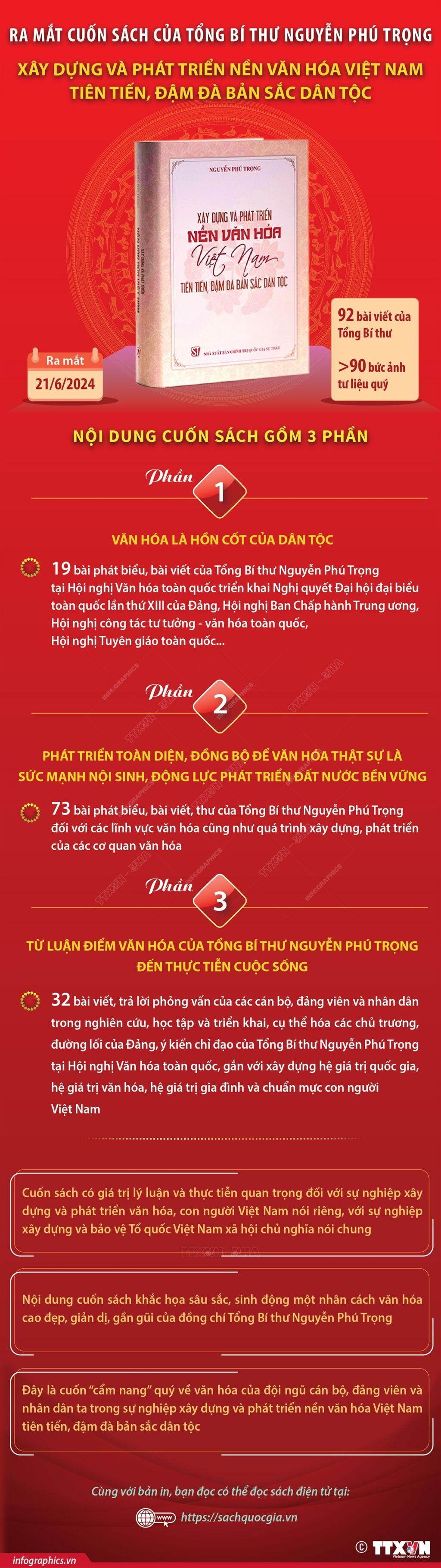 Chiều 21/6/2024, tại Hà Nội, Ban Tuyên giáo Trung ương, Bộ Văn hóa, Thể thao và Du lịch, Nhà xuất bản Chính trị Quốc gia Sự thật phối hợp tổ chức Lễ ra mắt cuốn sách "Xây dựng và phát triển nền văn hóa Việt Nam tiên tiến, đậm đà bản sắc dân tộc" của Tổng Bí thư Nguyễn Phú Trọng. Cuốn sách tuyển chọn 92 bài viết, bài phát biểu, bài nói, lược ghi, trả lời phỏng vấn, thư... của Tổng Bí thư Nguyễn Phú Trọng về xây dựng và phát triển nền văn hóa Việt Nam, trong đó bài viết sớm nhất là năm 1968. Nội dung các bài phát biểu, bài viết thể hiện sự quan tâm sâu sắc của Tổng Bí thư đối với việc xây dựng, giữ gìn và phát triển nền văn hóa Việt Nam với các yếu tố truyền thống và hiện đại, bản sắc và hội nhập, tạo nguồn lực nội sinh và huy động sức mạnh của văn hóa, con người Việt Nam trong công cuộc xây dựng, phát triển đất nước phồn vinh, hạnh phúc.