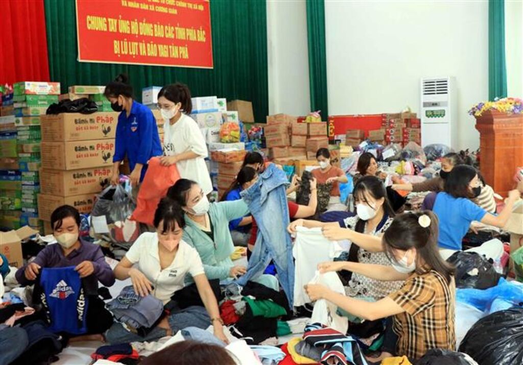 | Phân loại quần áo hỗ trợ đồng bào vùng lũ. |
