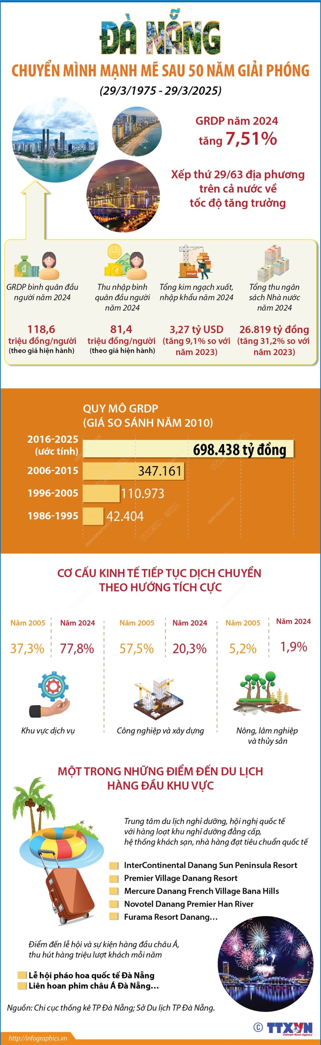 50 năm sau ngày giải phóng (29/3/1975 - 29/3/2025), Đà Nẵng đã có sự chuyển mình ngoạn mục, từ một thành phố chịu nhiều tổn thất sau chiến tranh, trở thành trung tâm kinh tế, du lịch và dịch vụ hàng đầu miền Trung. Tổng sản phẩm trên địa bàn (GRDP) năm 2024 của Đà Nẵng tăng 7,51% so với năm 2023. Tổng kim ngạch xuất, nhập khẩu năm 2024 đạt 3,27 tỷ USD, tăng 9,1% so với năm 2023. Thu nhập bình quân đầu người năm 2024 đạt 81,4 triệu đồng/người/năm... Với tốc độ tăng trưởng ấn tượng, hạ tầng hiện đại và chất lượng cuộc sống không ngừng được nâng cao, Đà Nẵng hôm nay không chỉ là một đô thị đáng sống mà còn là điểm đến hấp dẫn trên bản đồ du lịch quốc tế.