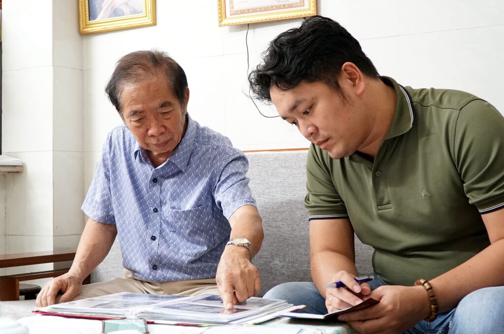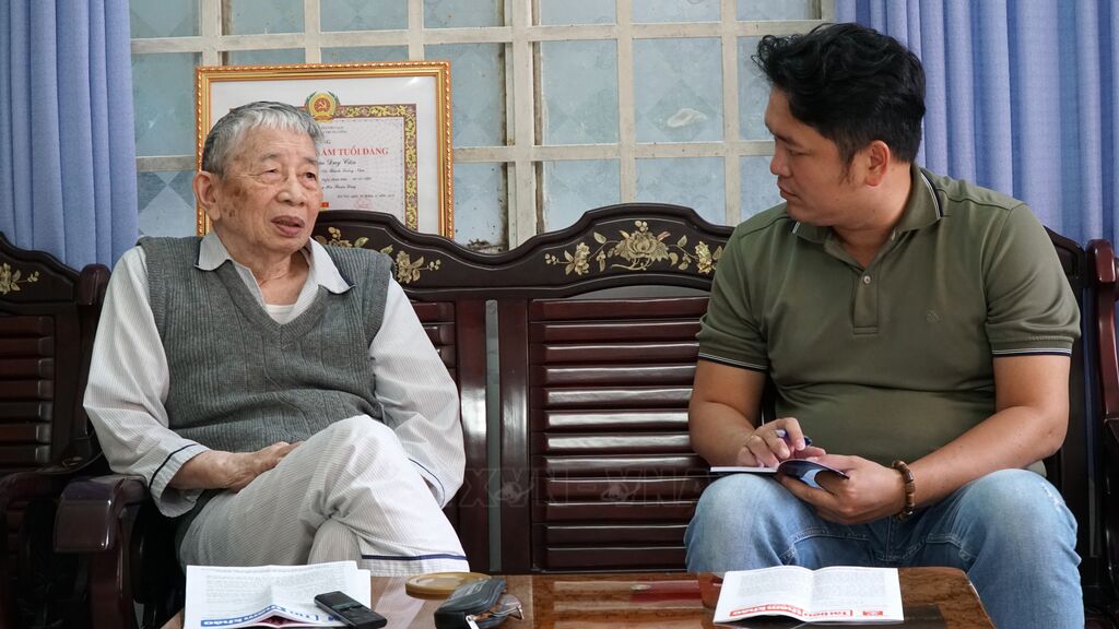 | Nhà báo Trần Xuân Quang (bên trái) chia sẻ lại những kỷ niệm trong cuộc đời phóng viên chiến trường tại Khu 5. |
