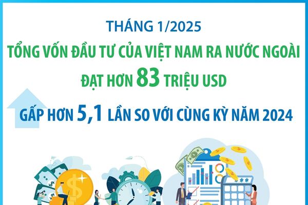 Tháng 1/2025, các nhà đầu tư Việt Nam đã đầu tư ra nước ngoài 10 dự án mới và không thực hiện điều chỉnh vốn đầu tư. Tổng vốn đầu tư của Việt Nam ra nước ngoài đạt hơn 83 triệu USD (gấp hơn 5,1 lần so với cùng kỳ năm 2024).