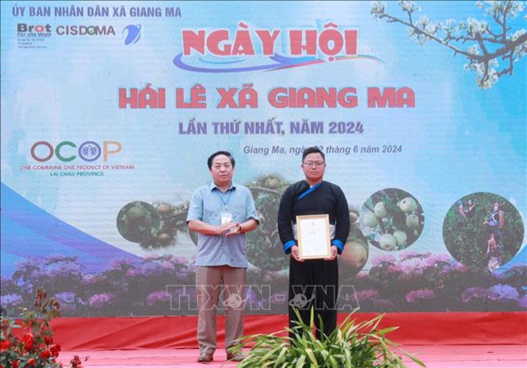 Tại ngày hội, UBND huyện Tam Đường trao Giấy chứng nhận sản phẩm OCOP hạng 3 sao cho sản phẩm lê Giang Ma của Tổ hợp tác chăm sóc, phát triển lê và liên kết tiêu thụ sản phẩm quả lê xã Giang Ma.