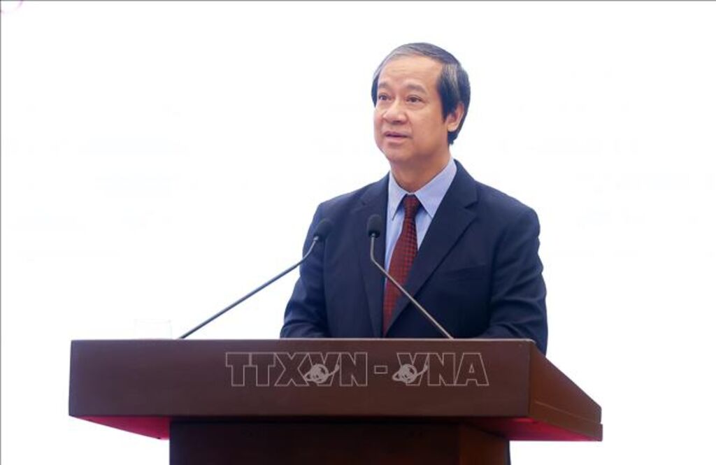 | Đồng chí Nguyễn Kim Sơn, Ủy viên Trung ương Đảng, Bộ trưởng Bộ Giáo dục và Đào tạo trả lời câu hỏi của phóng viên các cơ quan thông tấn, báo chí. |