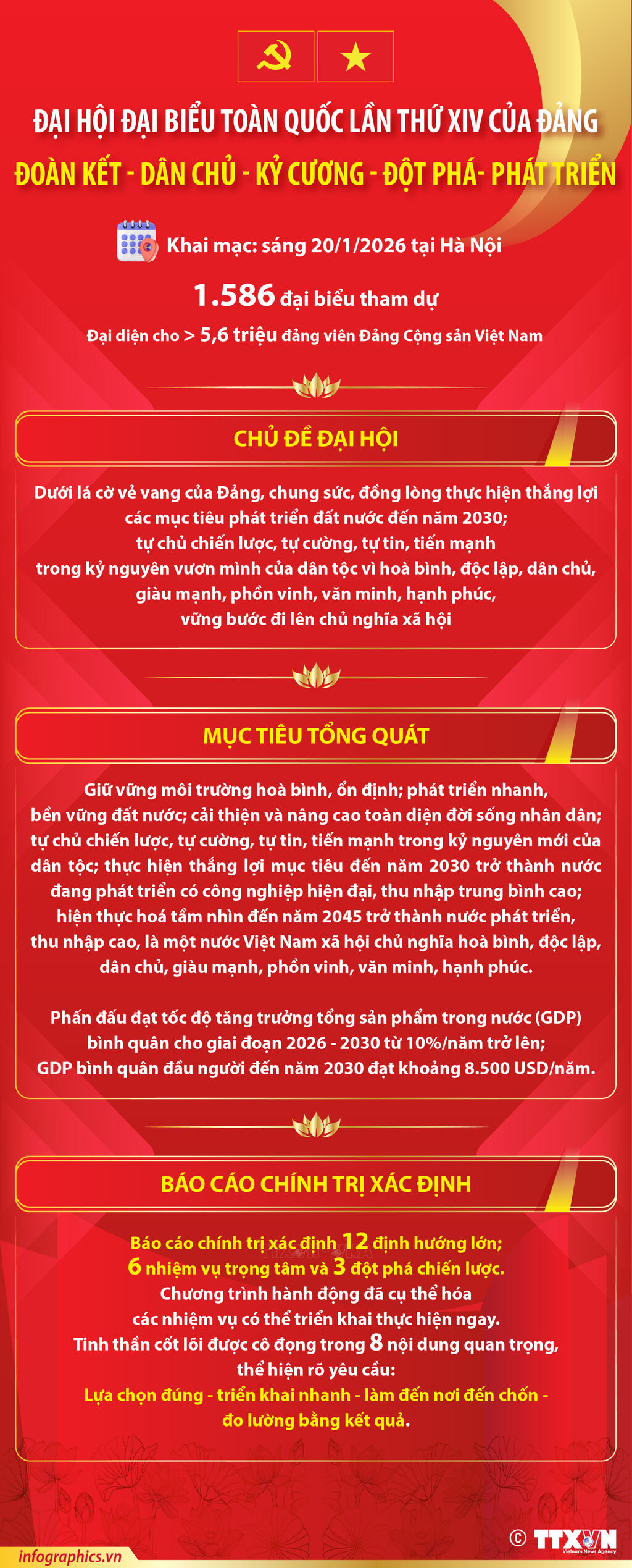 Đại hội đại biểu toàn quốc lần thứ XIV của Đảng với phương châm: “Đoàn kết - Dân chủ - Kỷ cương - Đột phá - Phát triển” khai mạc sáng ngày 20/1/2026 tại Hà Nội. Tham dự Đại hội có 1.586 đại biểu, đại diện cho hơn 5,6 triệu đảng viên Đảng Cộng sản Việt Nam.