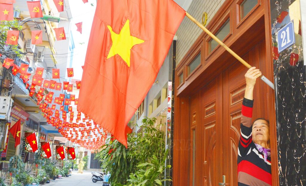 | Người dân phường Kinh Bắc, tỉnh Bắc Ninh treo cờ chào mừng Đại hội Đảng. |