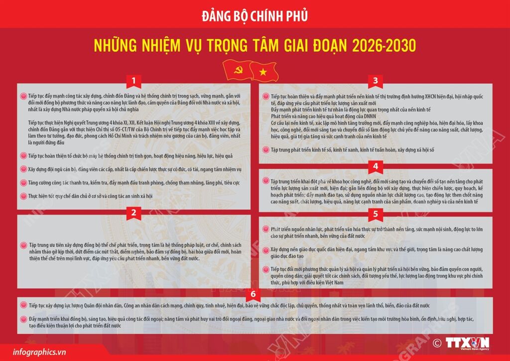 Giai đoạn 2026-2030, Đảng bộ Chính phủ đặt ra các nhiệm vụ trọng tâm như: Tiếp tục đẩy mạnh công tác xây dựng, chỉnh đốn Đảng và hệ thống chính trị trong sạch, vững mạnh, gắn với đổi mới đồng bộ phương thức và nâng cao năng lực lãnh đạo, cầm quyền của Đảng đối với Nhà nước và xã hội, nhất là xây dựng Nhà nước pháp quyền XHCN. Tập trung ưu tiên xây dựng đồng bộ thể chế phát triển, trọng tâm là hệ thống pháp luật, cơ chế, chính sách. Tiếp tục hoàn thiện và đẩy mạnh phát triển nền kinh tế thị trường định hướng XHCN hiện đại, hội nhập quốc tế, đáp ứng yêu cầu phát triển lực lượng sản xuất mới. Đẩy mạnh phát triển kinh tế tư nhân là động lực quan trọng nhất của nền kinh tế. Tập trung triển khai đột phá về khoa học công nghệ, đổi mới sáng tạo và chuyển đổi số tạo nền tảng cho phát triển lực lượng sản xuất mới, hiện đại…