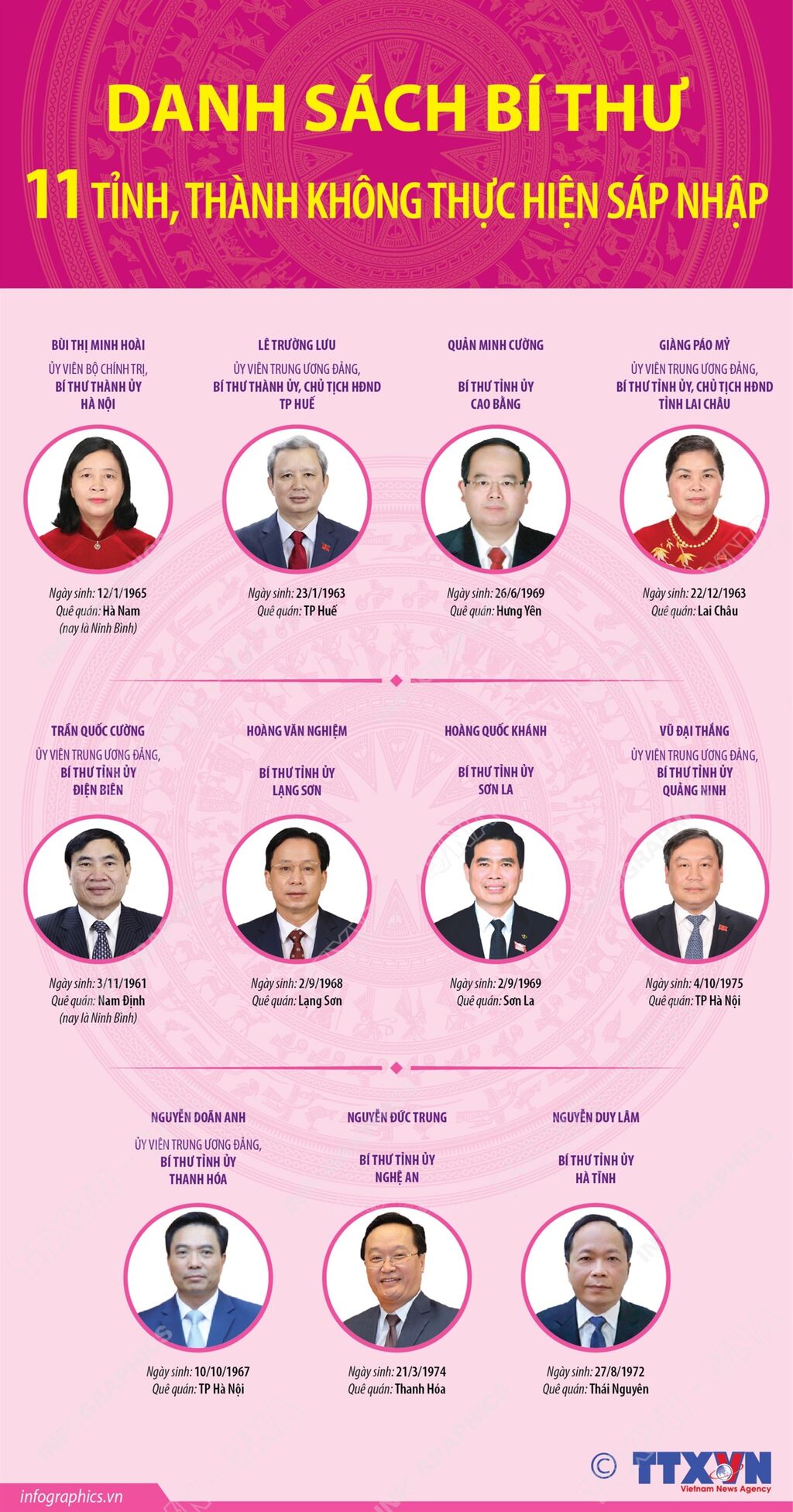 Sáng 30/6/2025, Lễ công bố các nghị quyết, quyết định của Trung ương và địa phương về sáp nhập đơn vị hành chính, thành lập tổ chức đảng, chỉ định cấp uỷ, Hội đồng nhân dân, Ủy ban nhân dân, Ủy ban Mặt trận Tổ quốc Việt Nam tỉnh, thành phố, xã, phường, đặc khu được thực hiện đồng bộ trên toàn quốc. TTXVN trân trọng giới thiệu danh sách 23 Bí thư các tỉnh, thành phố mới sau sáp nhập.
