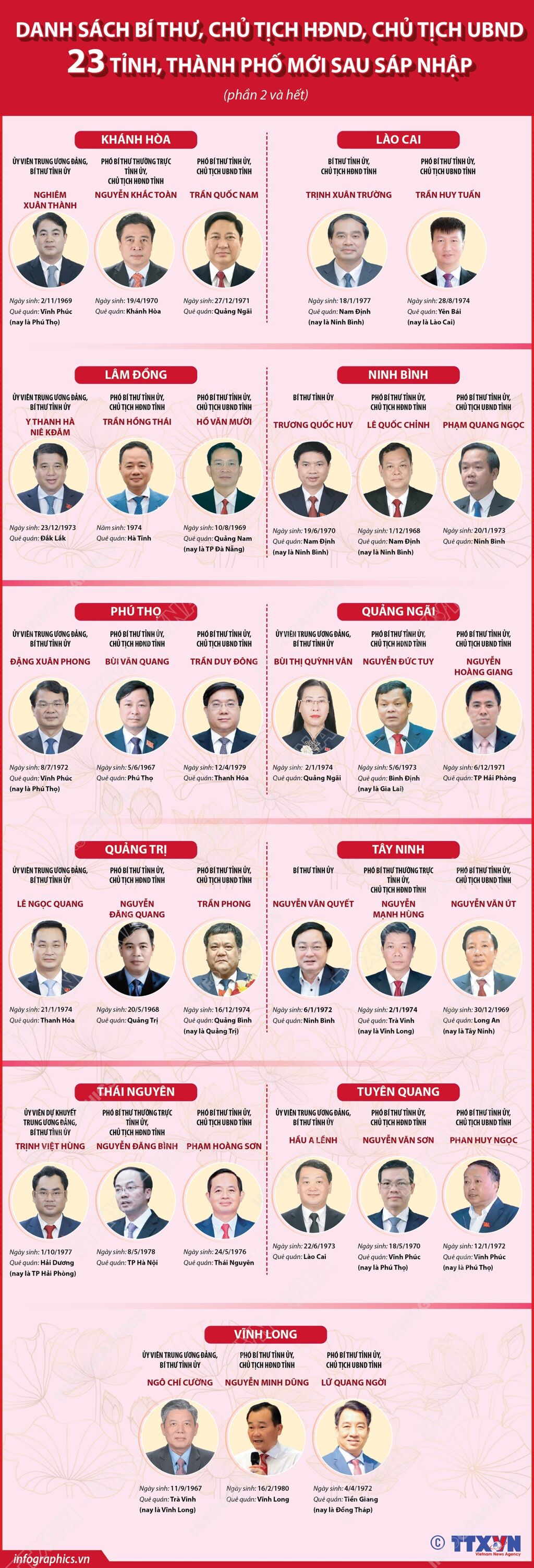Sáng 30/6/2025, Lễ công bố các nghị quyết, quyết định của Trung ương và địa phương về sáp nhập đơn vị hành chính, thành lập tổ chức đảng, chỉ định cấp uỷ, Hội đồng nhân dân, Ủy ban nhân dân, Ủy ban Mặt trận Tổ quốc Việt Nam tỉnh, thành phố, xã, phường, đặc khu được thực hiện đồng bộ trên toàn quốc. TTXVN trân trọng giới thiệu danh sách Bí thư, Chủ tịch HĐND, Chủ tịch UBND 23 tỉnh, thành mới sau sáp nhập.