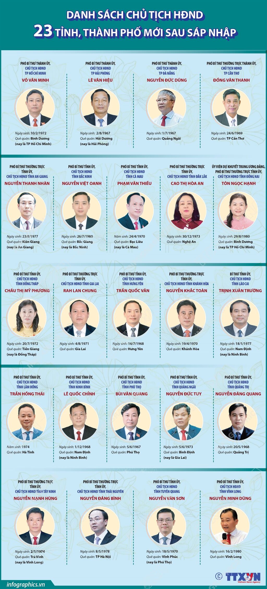 Sáng 30/6/2025, Lễ công bố các nghị quyết, quyết định của Trung ương và địa phương về sáp nhập đơn vị hành chính, thành lập tổ chức đảng, chỉ định cấp uỷ, Hội đồng nhân dân, Ủy ban nhân dân, Ủy ban Mặt trận Tổ quốc Việt Nam tỉnh, thành phố, xã, phường, đặc khu được thực hiện đồng bộ trên toàn quốc. Chủ tịch Quốc hội Trần Thanh Mẫn đã ký ban hành các Nghị quyết của Ủy ban Thường vụ Quốc hội chỉ định Chủ tịch, Phó Chủ tịch, Trưởng các Ban của Hội đồng nhân dân các tỉnh, thành phố sau hợp nhất, sáp nhập. Tất cả các Nghị quyết đều có hiệu lực thi hành từ ngày 1/7/2025. TTXVN trân trọng giới thiệu danh sách 23 Chủ tịch Hội đồng nhân dân các tỉnh, thành phố mới.