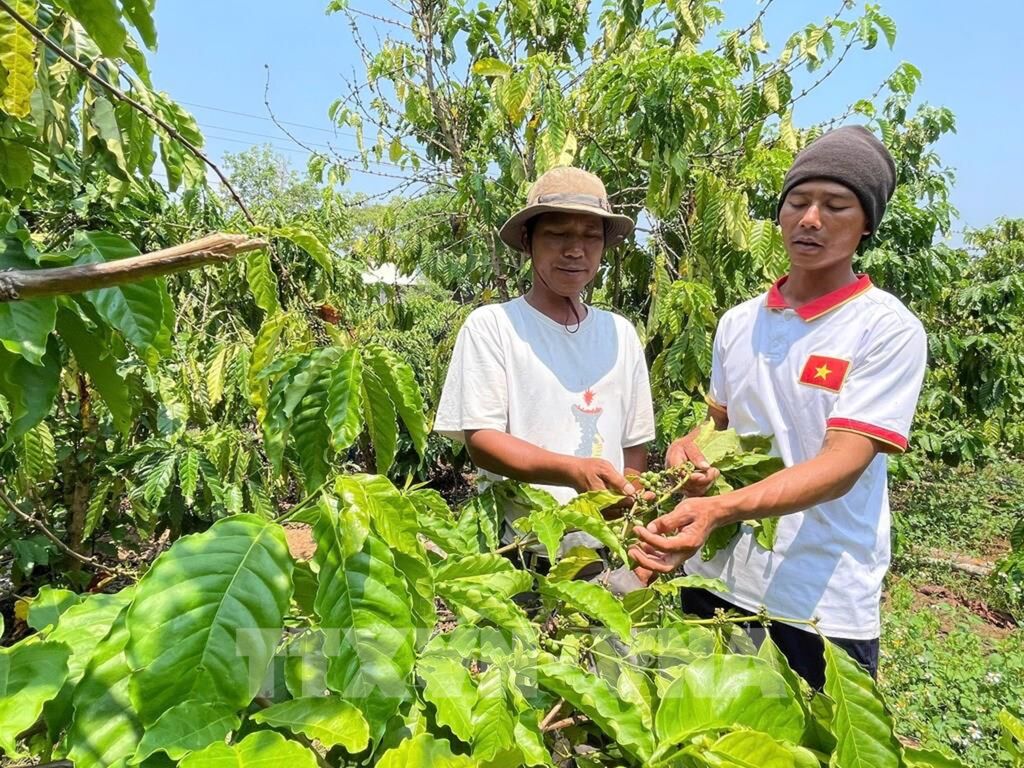 | Anh Đinh Vun (bên phải), làng Keo, xã Ayun (Gia Lai) là một trong những người tiên phong khi chuyển từ trồng mì, bắp, lúa rẫy sang trồng cà phê trên diện tích đất khô hạn. Ảnh: Hồng Điệp - TTXVN |