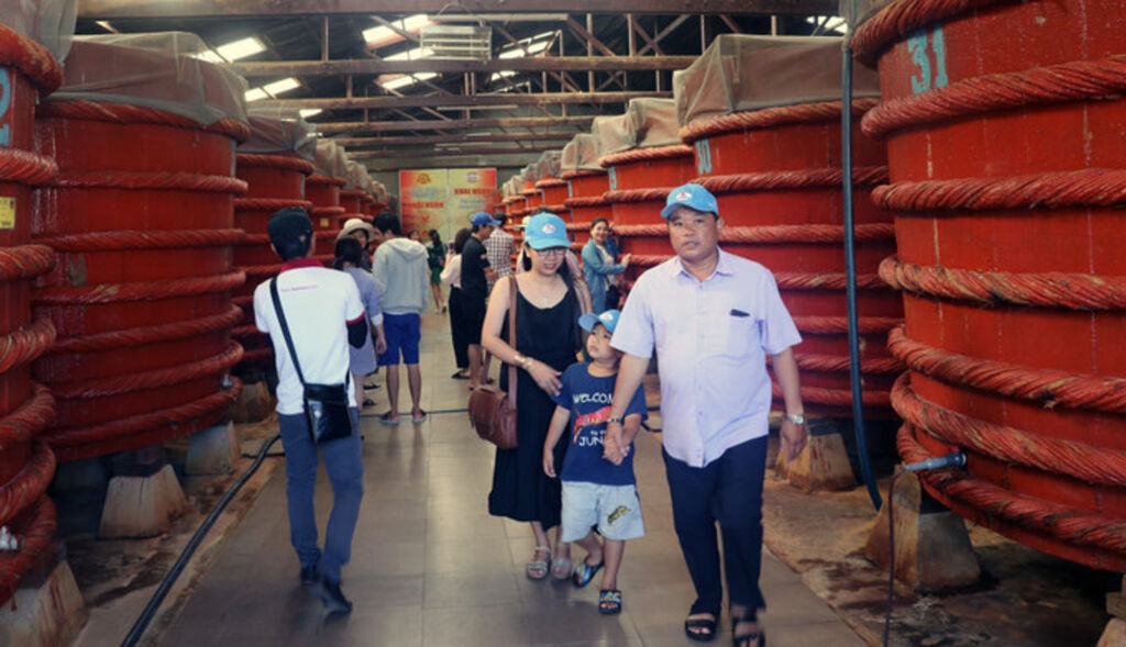 | Khách du lịch tham quan khu sản xuất nước mắm tại Nhà thùng nước mắm Khải Hoàn trên Đặc khu Phú Quốc. |