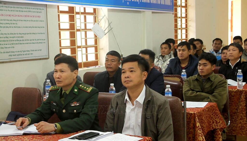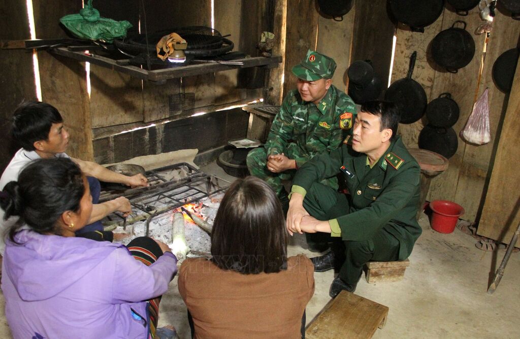 | Trung tá Vi Quý Mận, Phó Bí thư tăng cường xã Mường Ải, huyện Kỳ Sơn, tỉnh Nghệ An tuyên truyền vận động người dân chấp hành quy định về xuất nhập cảnh qua biên giới. |