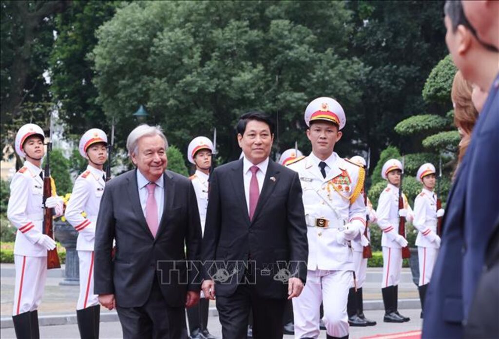 | Chủ tịch nước Lương Cường chủ trì lễ đón Tổng Thư ký Liên hợp quốc António Guterres thăm chính thức Việt Nam và tham dự Lễ mở ký Công ước Liên hợp quốc về chống tội phạm mạng (Công ước Hà Nội), chiều 24/10/2025. Ảnh: Lâm Khánh/TTXVN |