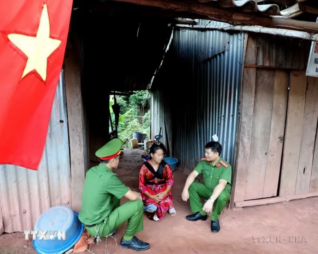 | Công an huyện Mường Nhé (Điện Biên) thăm hỏi chị Giàng Thị Xua (nạn nhân mua bán người) ở bản Co Lót. |