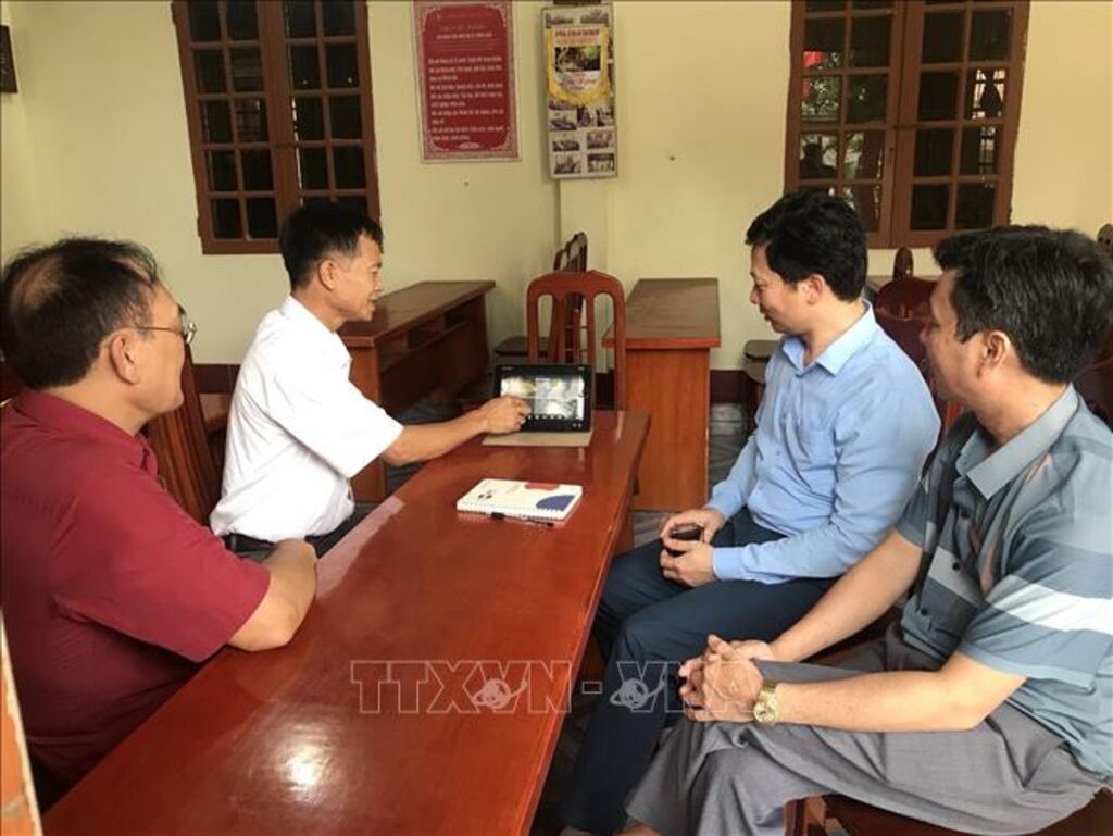| Lãnh đạo xã Thống Nhất, huyện Gia Lộc đang kiểm tra các camera giám sát tại khu dân cư của tổ chuyển đổi số cộng đồng. |
