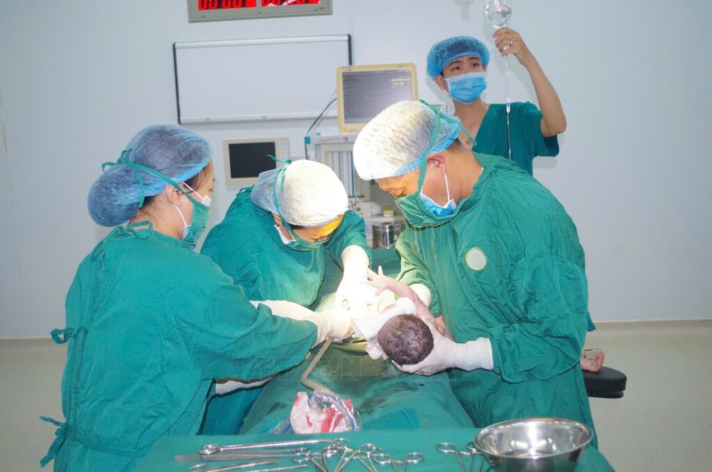 | Các y, bác sĩ tại Bệnh viện Quân y 15 thực hiện ca mổ sinh con. |