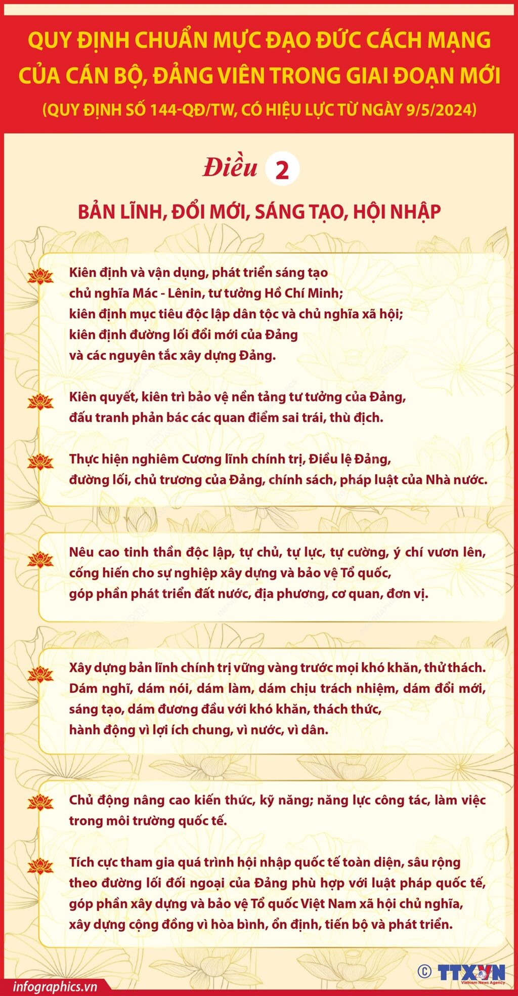 | Quy định chuẩn mực đạo đức cách mạng của cán bộ, đảng viên trong giai đoạn mới: Điều 2 - Bản lĩnh, đổi mới, sáng tạo, hội nhập |