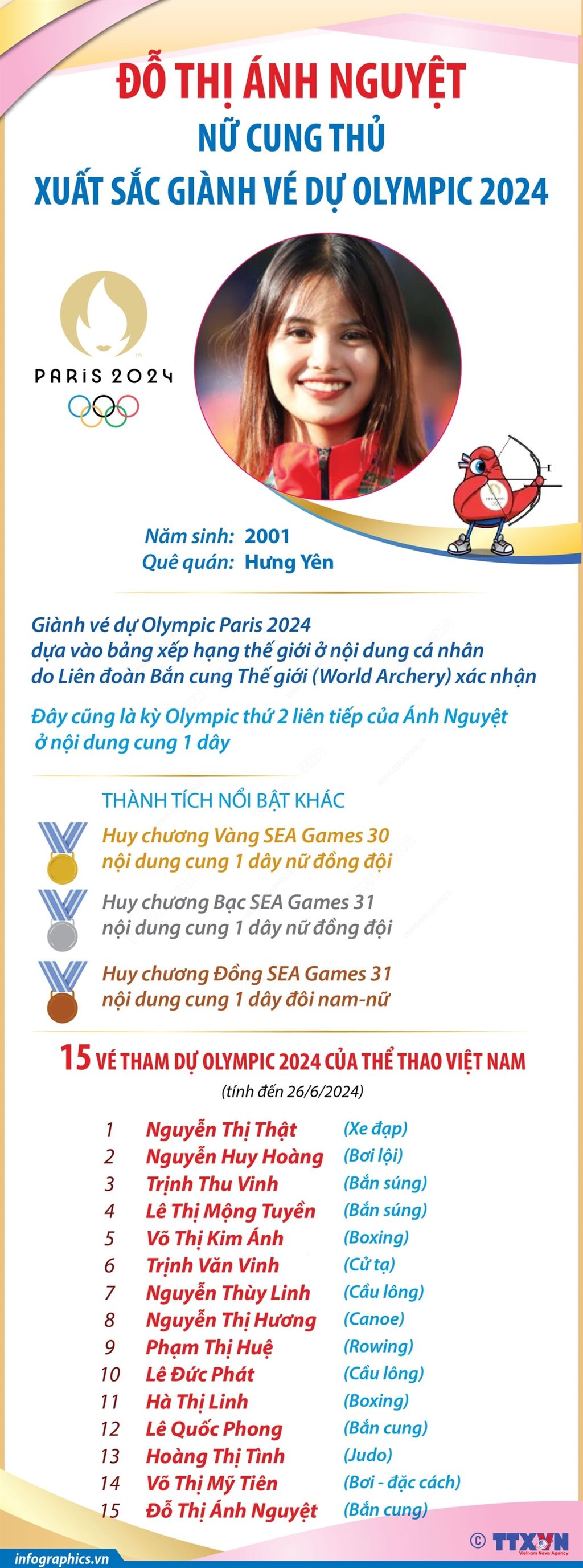 Tính đến ngày 26/6/2024, thể thao Việt Nam có 15 vé tham dự Olympic Paris 2024. Đó là các vận động viên: Nguyễn Thị Thật (xe đạp), Nguyễn Huy Hoàng (bơi lội), Trịnh Thu Vinh và Lê Thị Mộng Tuyền (bắn súng), Trịnh Văn Vinh (cử tạ), Nguyễn Thị Hương (canoe), Phạm Thị Huệ (Rowing) Nguyễn Thùy Linh và Lê Đức Phát (cầu lông); Võ Thị Kim Ánh và Hà Thị Linh (boxing); Lê Quốc Phong và Đỗ Thị Ánh Nguyệt (bắn cung); Hoàng Thị Tình (judo) và Võ Thị Mỹ Tiên (suất đặc cách môn Bơi).