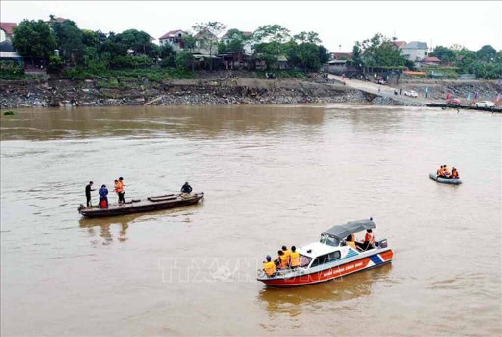 | Lực lượng chức năng tìm kiếm người mất tích trong vụ sập cầu Phong Châu tỉnh Phú Thọ do ảnh hưởng của cơn bão số 3 gây ra. |