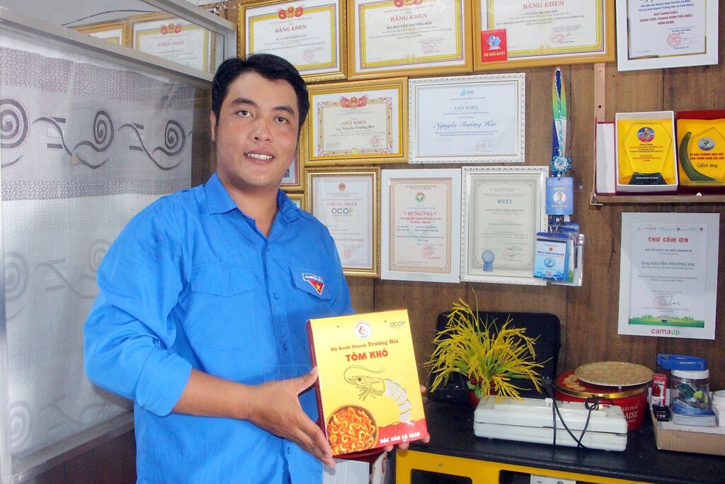 | Anh Nguyễn Trường Hải với sản phẩm tôm khô đạt chứng nhận OCOP 3 sao. |