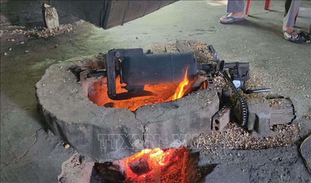 | Công đoạn quay quả nổ, canh lửa để có mẻ cốm gạo thơm ngon. |