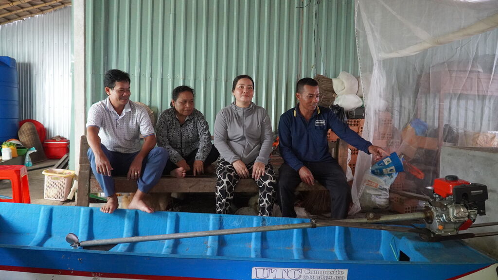 | Ông Danh Riêng, xã Bàn Thạch, huyện Giồng Riềng, tỉnh Kiên Giang (ngoài cùng bên phải) chỉ cho mọi người những phương tiện sản xuất gia đình được hỗ trợ. |