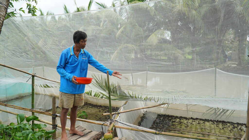 | Ông Danh Ngọc chăm sóc ếch nuôi được xã hỗ trợ con giống. |