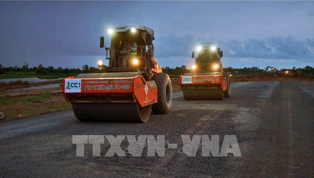 | Với tinh thần “vượt nắng, thắng mưa”, các đơn vị thi công quyết tâm làm đêm, làm ngày để hoàn thành dự án đúng tiến độ đề ra. Ảnh: Huỳnh Anh /TTXVN. |