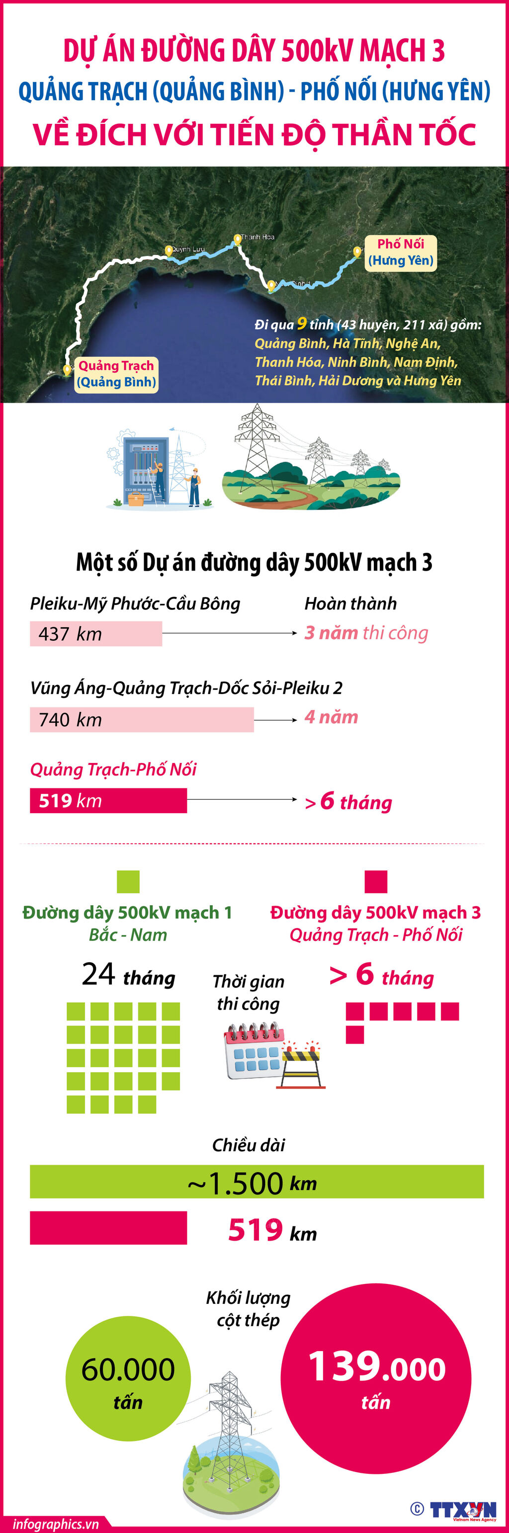 Ngày 29/8/2024, Tập đoàn Điện lực Việt Nam (EVN), Tổng công ty Truyền tải điện Quốc gia (EVNNPT) tổ chức Lễ khánh thành Dự án đường dây 500kV mạch 3 Quảng Trạch (Quảng Bình) đến Phố Nối (Hưng Yên). Nếu như đường dây 500kV Bắc - Nam mạch 1 đã nối liền dòng điện Bắc - Nam, đặt nền móng cho những bước phát triển lâu dài của ngành điện, thì Dự án đường dây 500kV mạch 3 là một Dự án đặc biệt, phát huy sức mạnh của cả hệ thống chính trị với khối lượng xây dựng khổng lồ, về đích với tiến độ thần tốc - đã tạo nên dấu ấn tinh thần mạch 3 và kỳ tích của ngành điện.