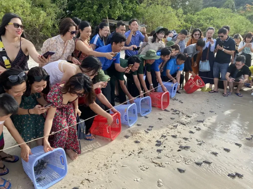 | Các đoàn du khách rất thích thú khi tự tay mình thả rùa con về biển Vườn Quốc gia Côn Đảo. |