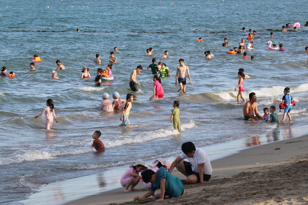 | Du khách giải trí, tắm biển tại biển Bình Sơn (thành phố Phan Rang - Tháp Chàm, Ninh Thuận). |