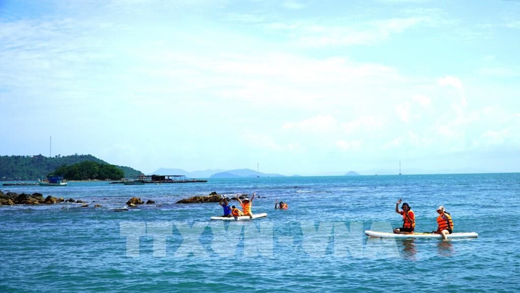 | Du khách trải nghiệm chèo SUP và lặn mò hải sản ở ven quần đảo Hải Tặc. Ảnh: Văn Sĩ - TTXVN |